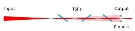 研究人员利用激光脉冲时域上噪声和主脉冲的强度差别引起的自聚焦效应差别:主脉冲部分可以通过薄片堆获得空间上级联聚焦,而噪声部分由于自聚焦效应的缺失随传播距离发散。这样,通过小孔滤波,可以实现激光主脉冲和噪声的空间分离,从而达到信噪比提升的效果。激光薄片堆中的自相位调制同时引起脉冲光谱展宽,通过色散补偿可以获得周期量级脉冲输出。这里,采用一个简单装置同时实现脉冲信噪比提升和光谱展宽,大大简化了之前获得高信噪比周期量级脉冲常用的两步走技术,即:先通过脉冲净化技术获得高信噪比脉冲,再通过非线性光谱展宽技术获得周期量级脉冲输出。