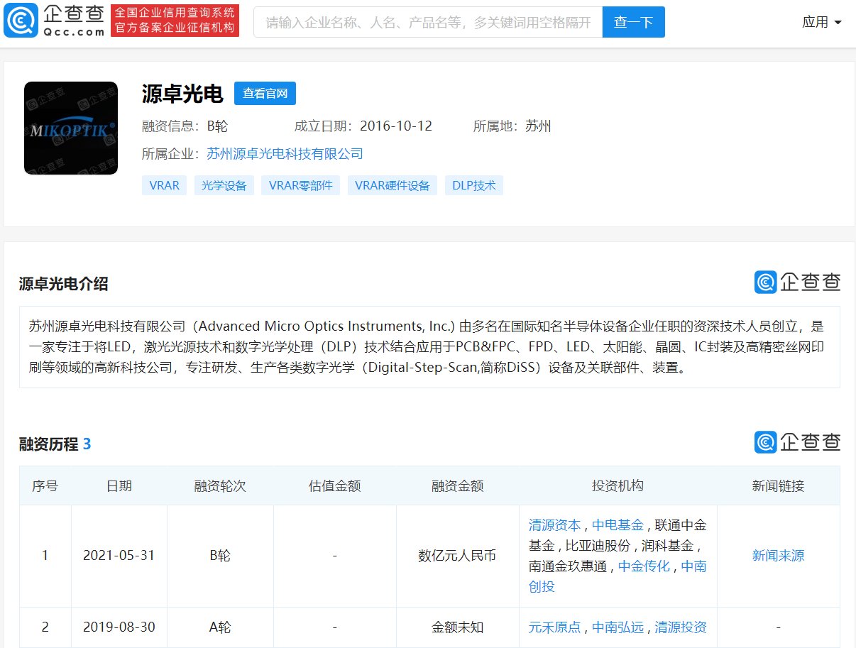 企查查APP显示,5月31日,源卓光电完成B轮战略融资。本轮的投资方包括中金资本旗下中金传化基金、联通中金基金、比亚迪股份、润科基金、中电基金、清源资本、中南创投、南通金玖惠通。企查查显示,源卓光电成立于2016年10月,注册资本约1536.31万元,法定代表人为张雷,经营范围包含从事光机电系统、智能设备及配套系统软件等。企查查融资信息显示,该公司目前共经历3轮融资。